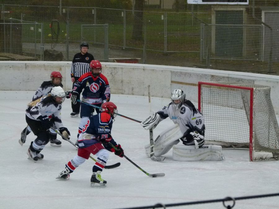 Pünktlich zum Eröffnungsbully der Partie, bei der Trainer Mario Sorsak auf 16 Spieler – darunter drei Doppellizensspieler aus Landshut – zurückgreifen konnte, begann es in der Open-Air-Arena in Trostberg an zu schneien. Davon unbeeindruckt versuchten die Knaben aus Dorfen/Gebensbach sofort das Spiel zu bestimmen und bereits nach 11 Spielminuten wurden sie per Doppelschlag durch Bastian Kosmann und Andreas Nikonow mit der 2:0 Führung belohnt. Dieser Vorsprung wirkte beruhigend und Dorfen/Gebensbach ließ Scheibe und Gegner laufen. Als Nikonow vier Sekunden vor Drittelende auf 3:0 erhöhte, wurden zum ersten Mal die Seiten gewechselt.