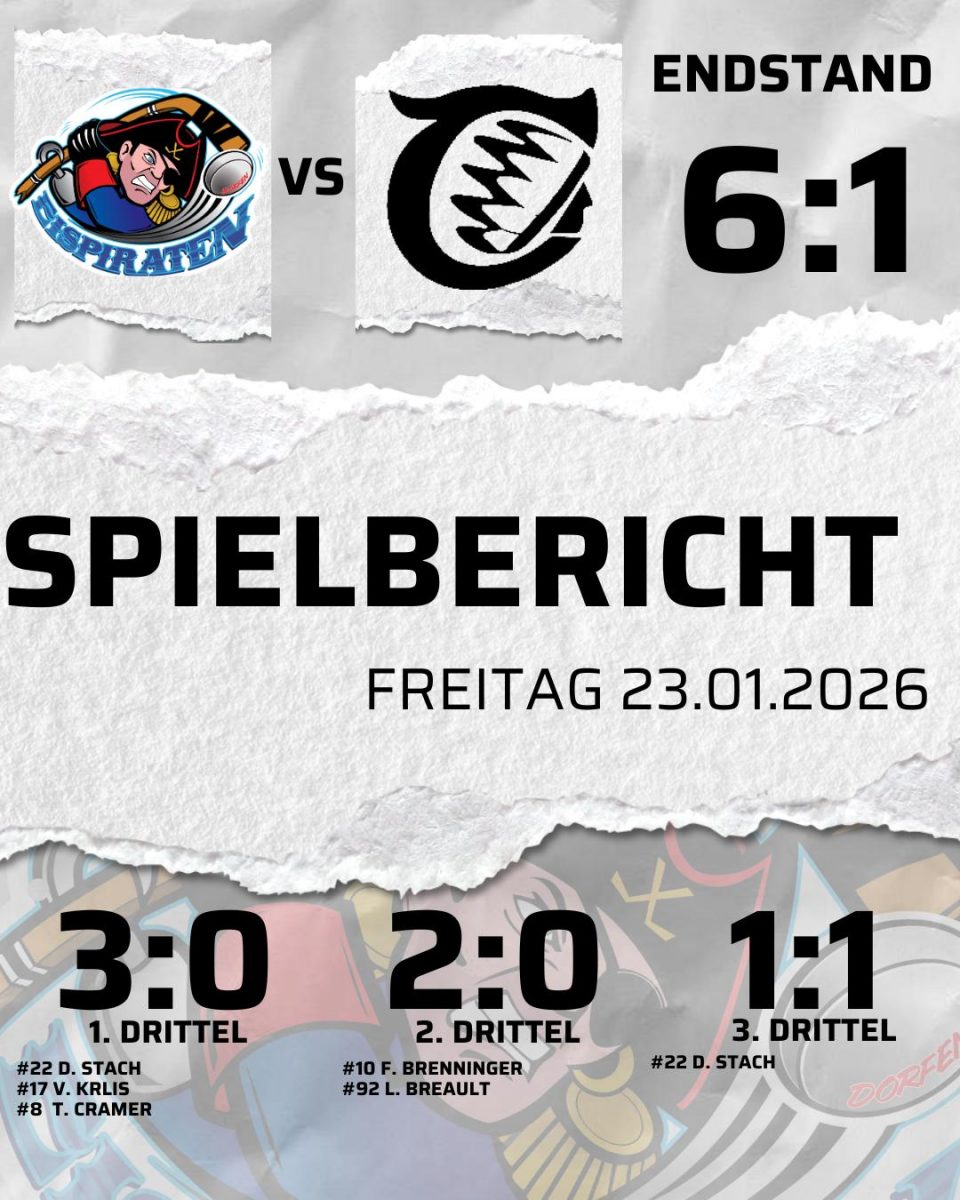 Ehe er am Freitagabend nach dem Spiel das Mikrofon an die beiden Trainer übergab, fasste PK-Moderator Sigi Maintok das Spiel kurz zusammen: „Der 6:1-Sieg unserer Eispiraten war ein hartes Stück Arbeit in einem Bomben-Spiel mit zwei Super-Torhütern“.