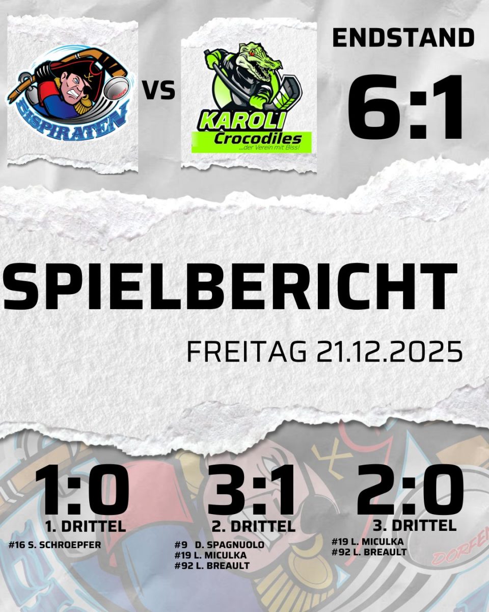 Im Schlussabschnitt hatten die Eispiraten zunächst den Schlendrian mit im Spiel. Bis zur ersten Strafzeit dieses fairen Spiels. Diese kassierten die Gäste und ein Powerplay wie am Schnürchen schloss Miculka mit tollem Schuss zum 5:1 (43.) ab. Auch Dorfen kassierte seine Strafe und der Shorthander zum 6:1 war eine einzige Breault-Gala (52.). Keeper Karabadjakov durfte sich nochmal gegen Tolle und mit starker Fanghandparade gegen Zachary Bridges auszeichnen, ehe die Schlusssirene ein sehr unterhaltsames Eishockeyspiel beendete.