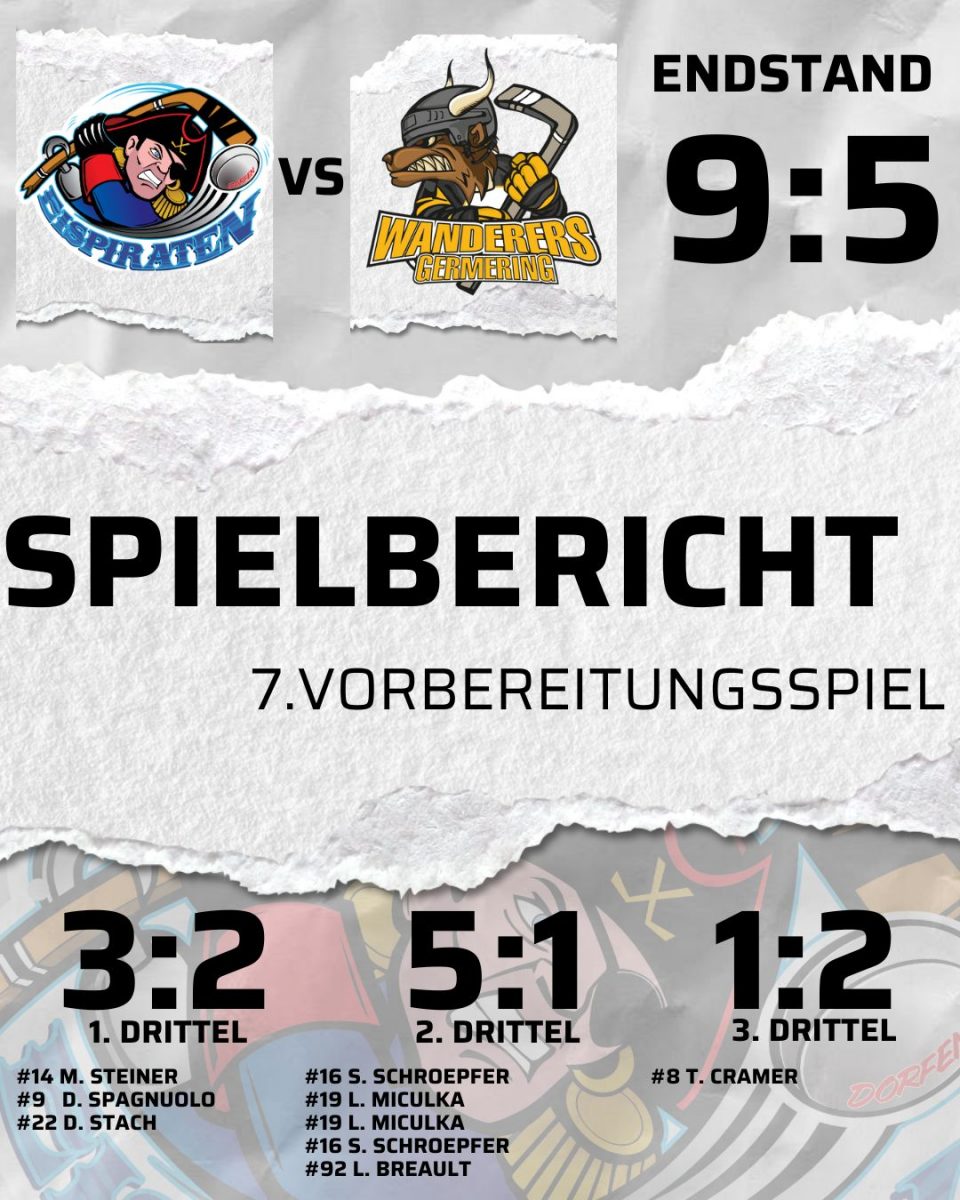Ein munteres Schützenfest war der letzte Test der ESC-Eispiraten vor dem Start in die Landesliga-Saison. 9:5 (3:2,5:1, 1:2) wurden am Freitagabend die Wanderers EV Germering aus der Landesliga Gruppe A abgefertigt. Das für Sonntag angesetzte Spiel gegen den EV Fürstenfeldbruck, ebenfalls aus der Gr. A, wurde vom Gegner am Samstagabend wegen zu vieler kranker Spieler abgesagt.