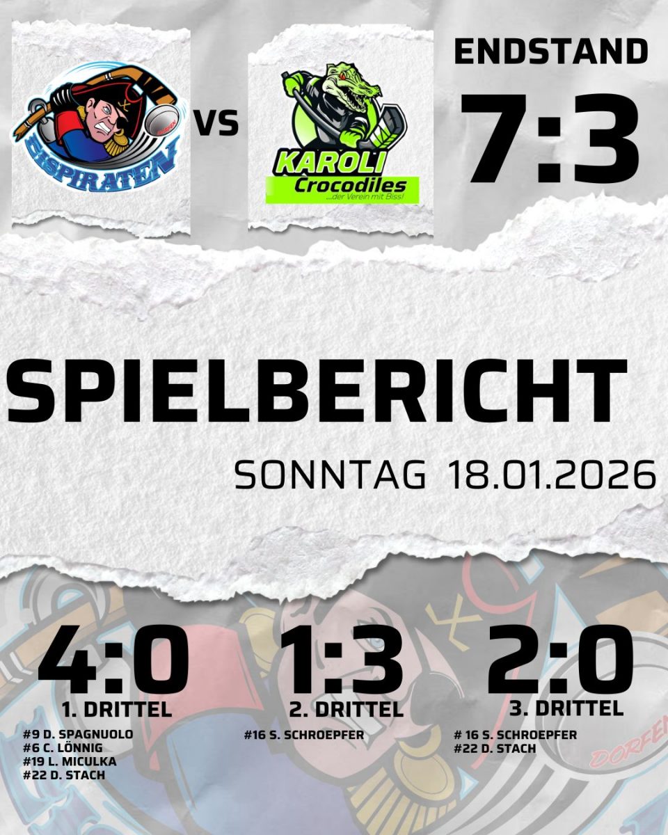 Gegen sichtlich geschockte Eispiraten bissen die Crocodiles zu mit zwei Treffern durch Nico Tolle, der erste davon in Überzahl. Wieder aus den Kabinen zurück, übernahmen die Eispiraten aber wieder das Zepter. Einmal scheiterte Schroepfer an Resch, sein nächster Versuch war drin zum 6:3 (48.). Dann Strafe gegen Waldkirchen: Stach an den Pfosten, Breault scheitert an Resch und Stach schließt zum 7:3 ein ganz starkes Powerplay ab. Die Eispiraten blieben Herr auf dem Eis, auch wenn ihr Keeper noch eine ganz starke Parade gegen Tolle auspacken musste.